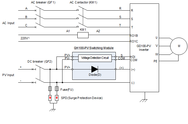 El módulo de conmutación QH100-PV es un módulo desarrolado por INV para la serie GD100-PV para conmutar automáticamente de planta solar a red, ya que generalmente los inversores de bombeo no permiten la conexión simultánea de la red y Planta Solar